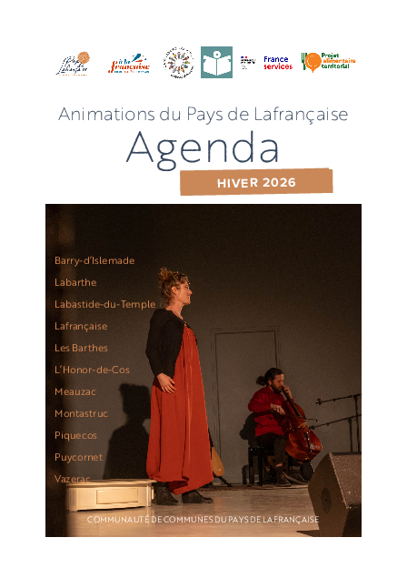 Voici via le lien ci-dessous, l'agenda avec les animations d'hiver proposées par le Centre Social Intercommunal du Pays de Lafrançaise, le Centre Culturel du Pays de Lafrançaise le Projet Alimentaire de Territoire, France Services et À LaFrançaise Tourisme soutenu par la Communauté de Communes du Pays de Lafrançaise. Renseignements et réservations des différentes animations auprès des services concernés : Centre social : 05 63 02 39 99, Médiathèque de Lafrançaise : 05 63 02 39 90, Médiathèque de Loubéjac : 05 63 31 81 26 Médiathèque de Vazerac : 05 63 67 53 18, Médiathèque de Labastide-du-Temple : 05 63 31 97 50, France Services 05 63 65 91 90 (touche 1), Projet Alimentaire de Territoire : 06 02 15 83 51 et Office de Tourisme 05 63 65 91 10