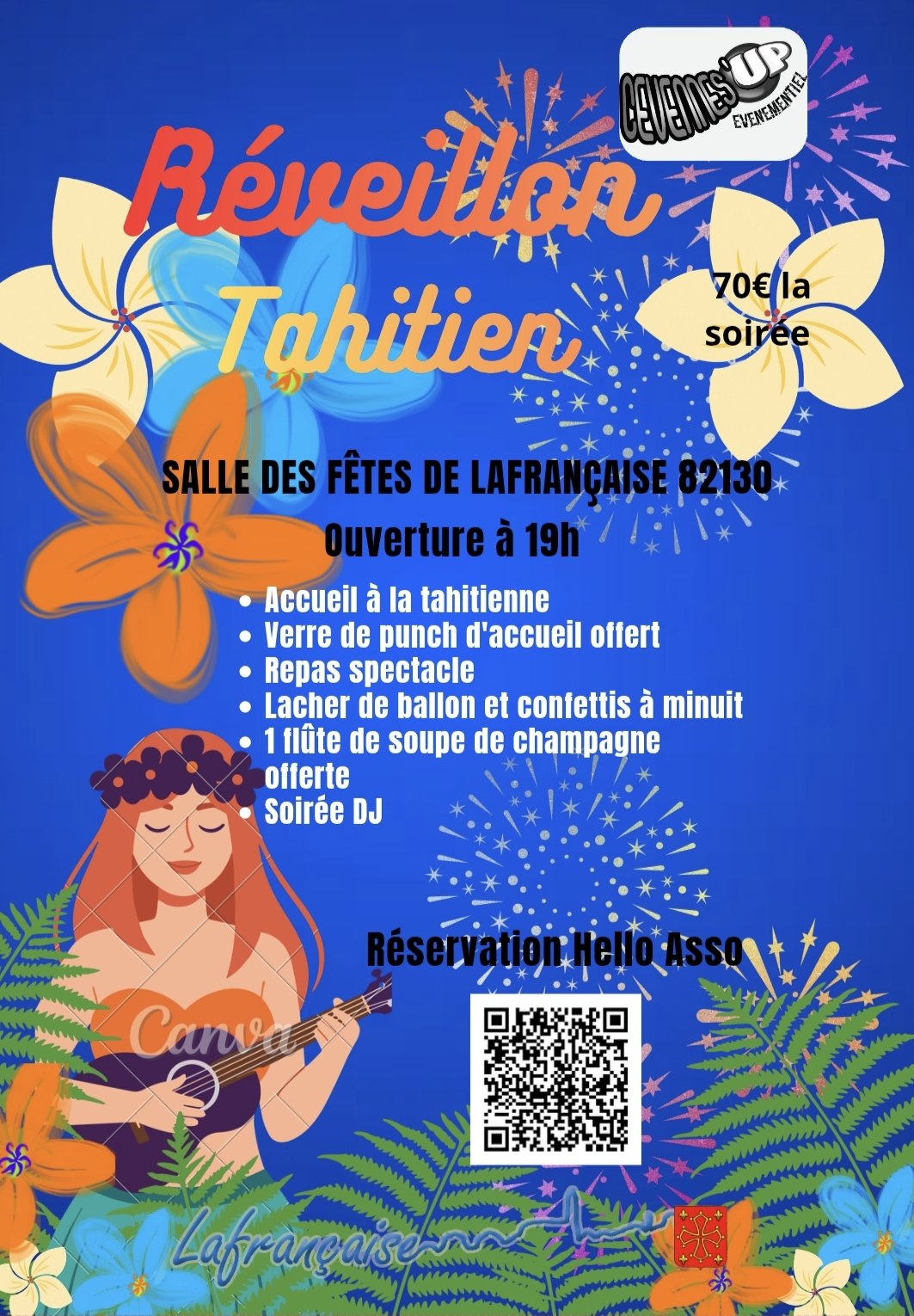 Réveillon Tahitien à Lafrançaise : Une Soirée Exotique pour le Nouvel An Mercredi 31 décembre à partir de 19h À la salle des fêtes de Lafrançaise (82130) 70€ la soirée Plongez dans une ambiance tahitienne pour célébrer le Nouvel An en beauté. Au programme : Verre de punch d’accueil offert. Repas spectacle avec un menu inspiré des saveurs de Tahiti. Lâcher de ballons et confettis à minuit. Flûte de soupe de champagne offerte. Soirée DJ pour danser jusqu’au bout de la nuit. Découvrez le menu spécial : Cocktail apéritif : Planche de tapas. Entrée : 2 beignets de crevette, 3 nems au poulet, sashimi de thon accompagné de chou blanc et sa sauce spéciale. Plat : 2 brochettes de cœur de veau, salade russe, bol de riz accompagné de sa sauce. Dessert : Gâteau banane au lait de coco, salade de fruits frais. Boissons : Café, thé et fromages. Réservation obligatoire : Via le lien Hello Asso : www.helloasso.com/associations/cevennes-up-evenementiel/evenements/reveillon-nouvel-an Places limitées, réservez vite pour une soirée inoubliable !